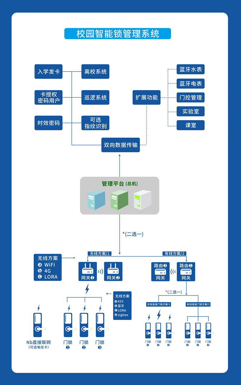 系統由有線/無線校園智能門鎖、智能網關、物聯網管理平臺組成,通過與學校數據中心、宿舍系統、迎新系統、畢業離校系統、琴房管理系統、一卡通系統等無縫對接,對每把門鎖進行實時狀態監控,實現開門授權、安全防控、數據統計、巡更及假期管理等功能,較大地減少宿管人員及管理教師的工作量,使宿管工作由“汗水管理”向“智慧管理”轉變,提高學校數據可視化、透明化、統一化管理程度,配合打造學生行為大數據分析閉環。